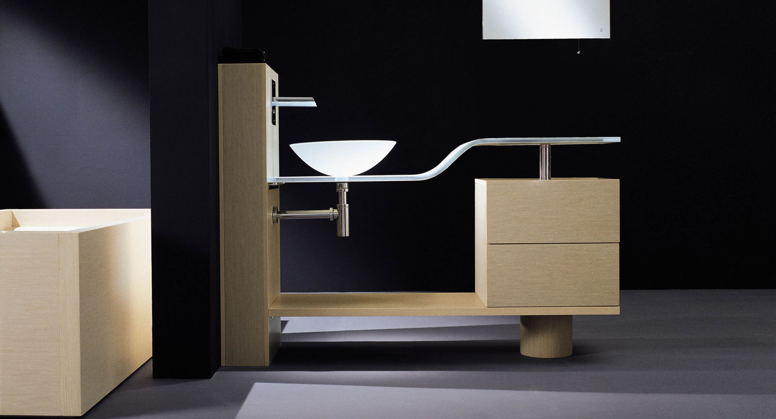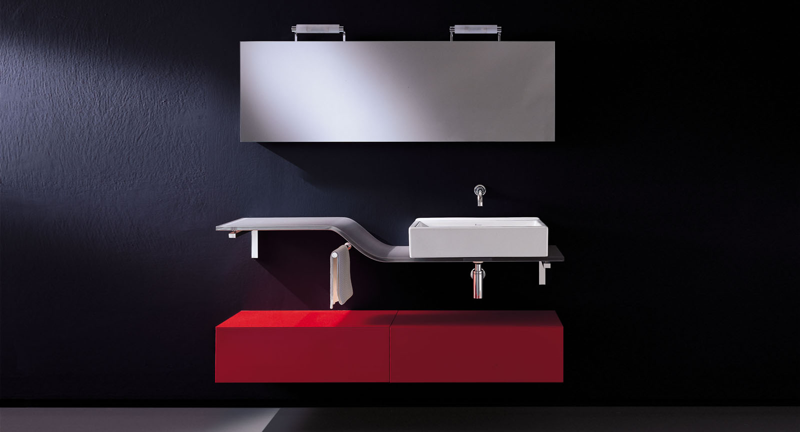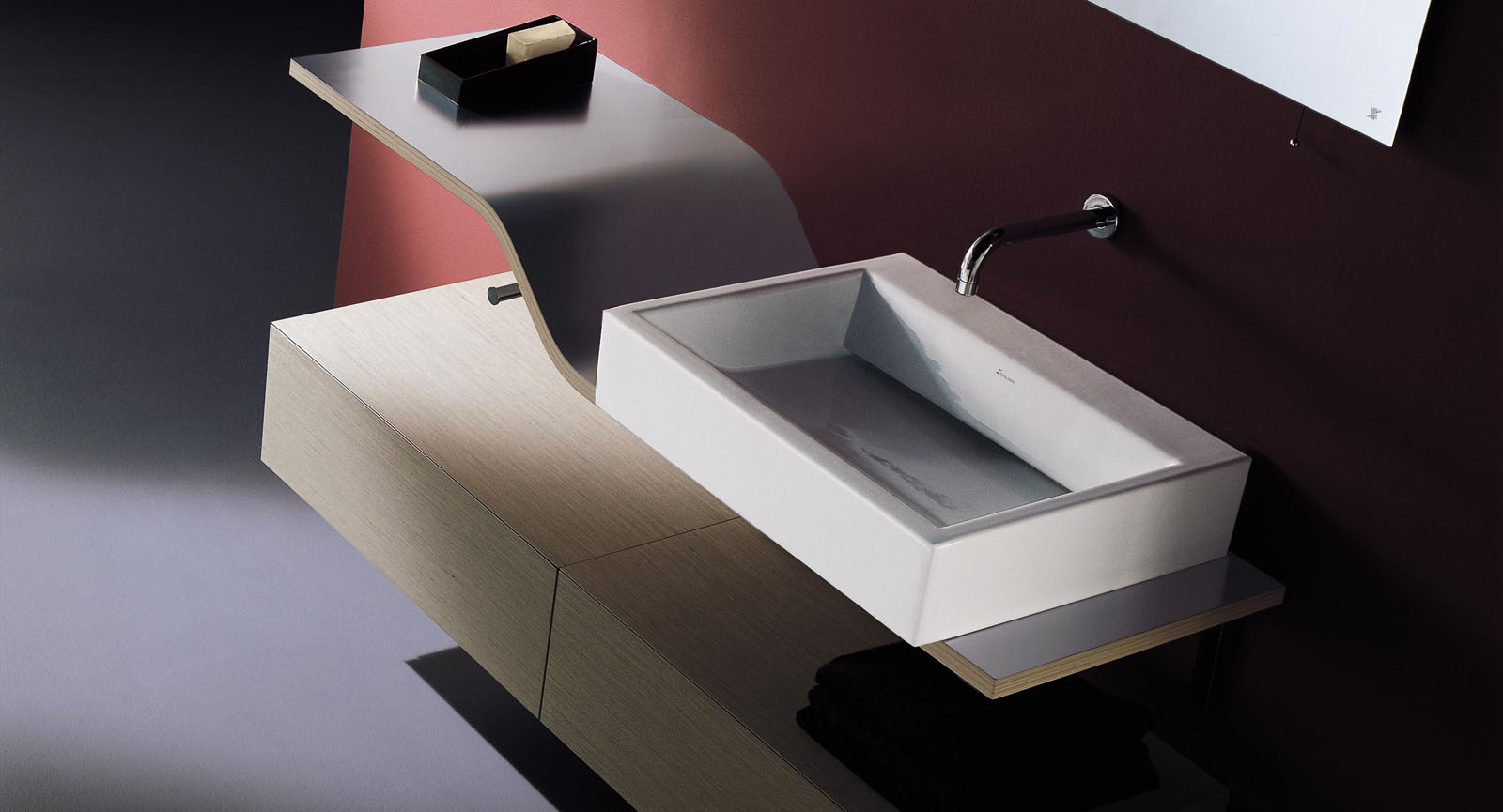 Il top a seconda di come viene orientato può accogliere con dimensioni personalizzate il singolo lavabo a destra o a sinistra, in basso o in alto, o avere anche la soluzione col doppio lavabo a differenti altezze.